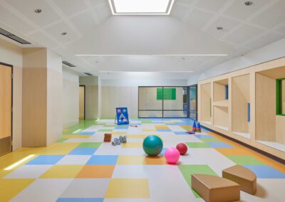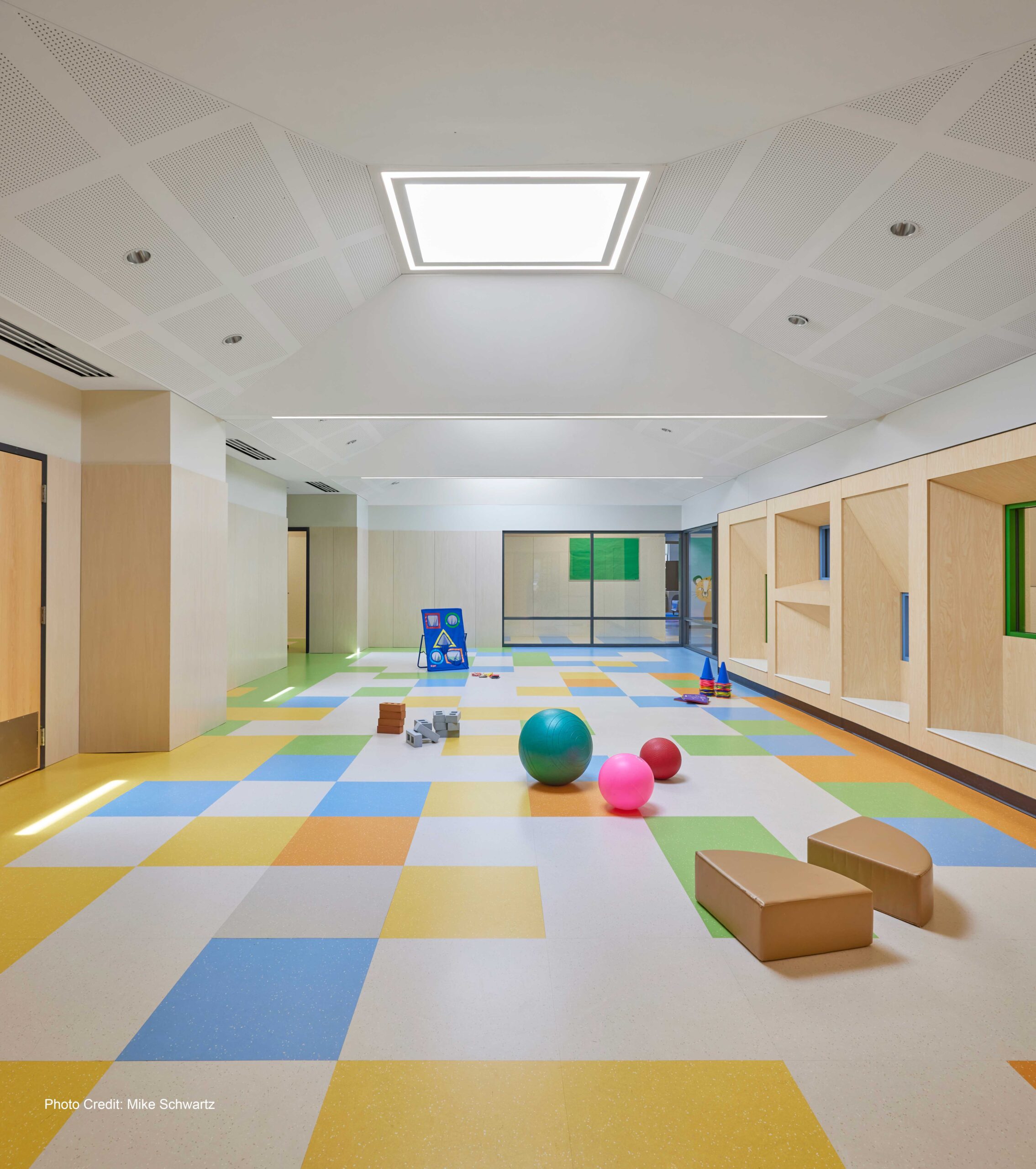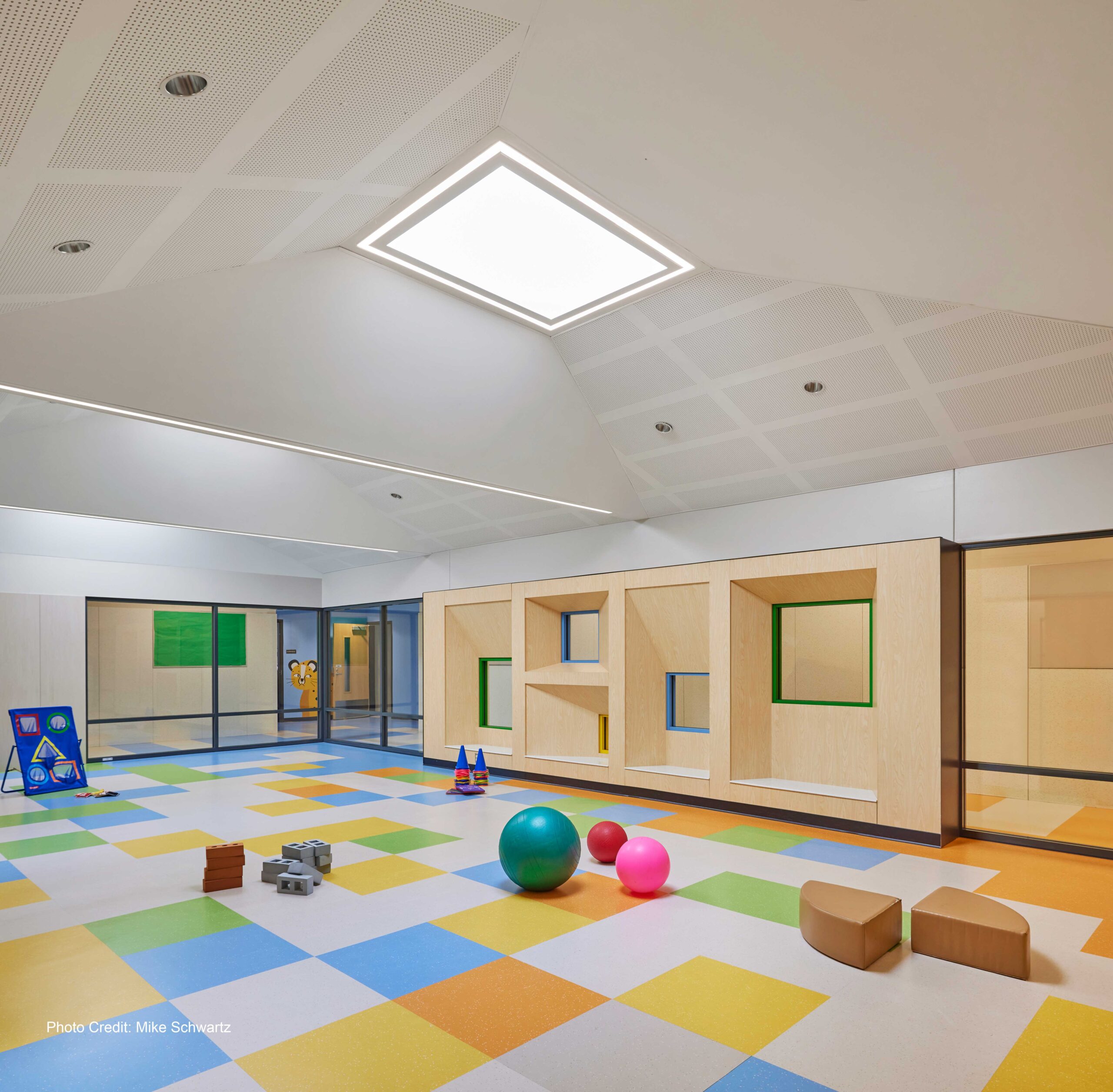The multi-purpose room has sloped ceilings that accentuate the existing skylights. Special acoustical drywall is used in this space to help control and diffuse the sound of children playing. There is also a special millwork feature wall that has multiple benches and windows at different heights and sizes, helping to encourage creative play.