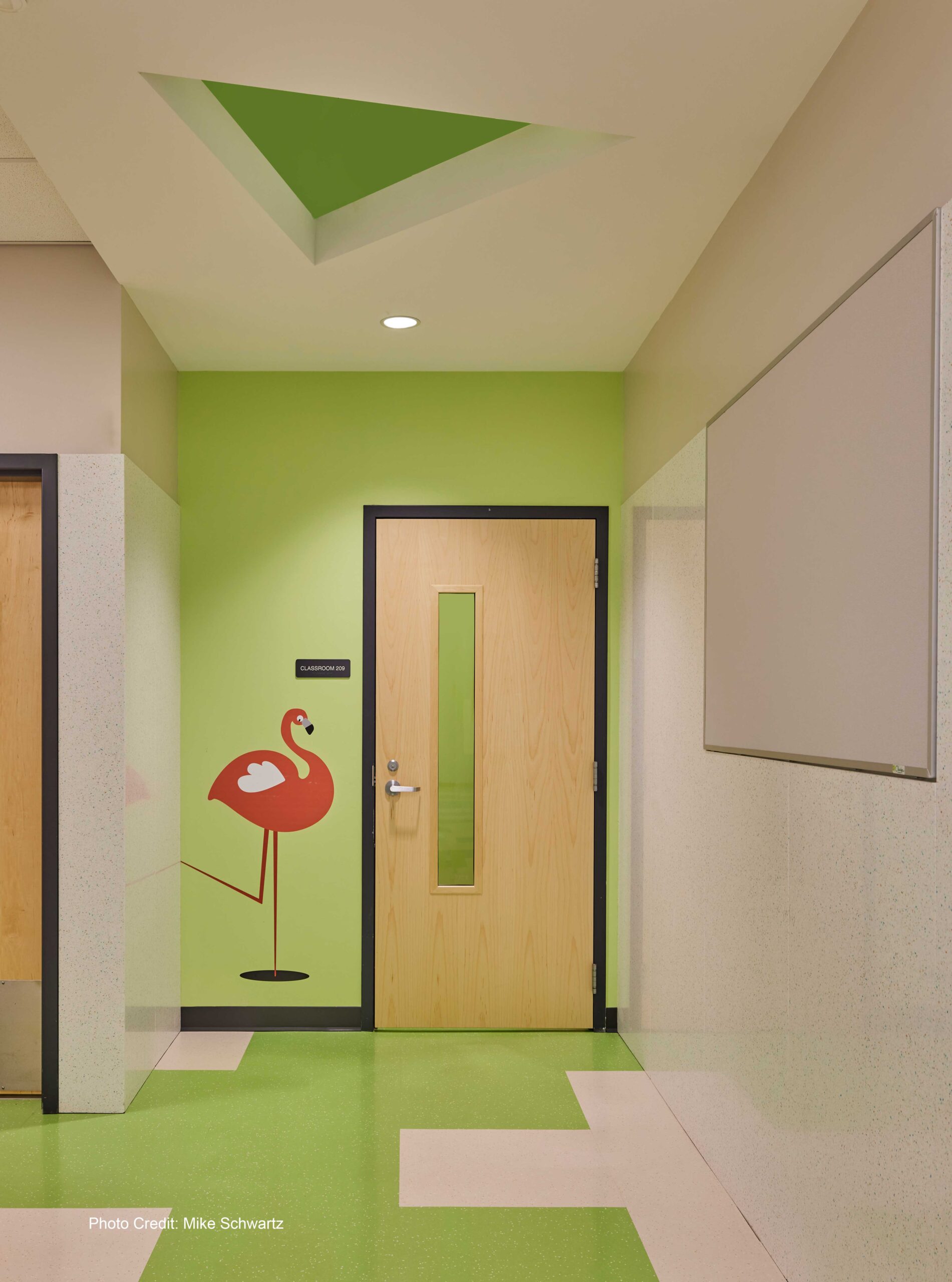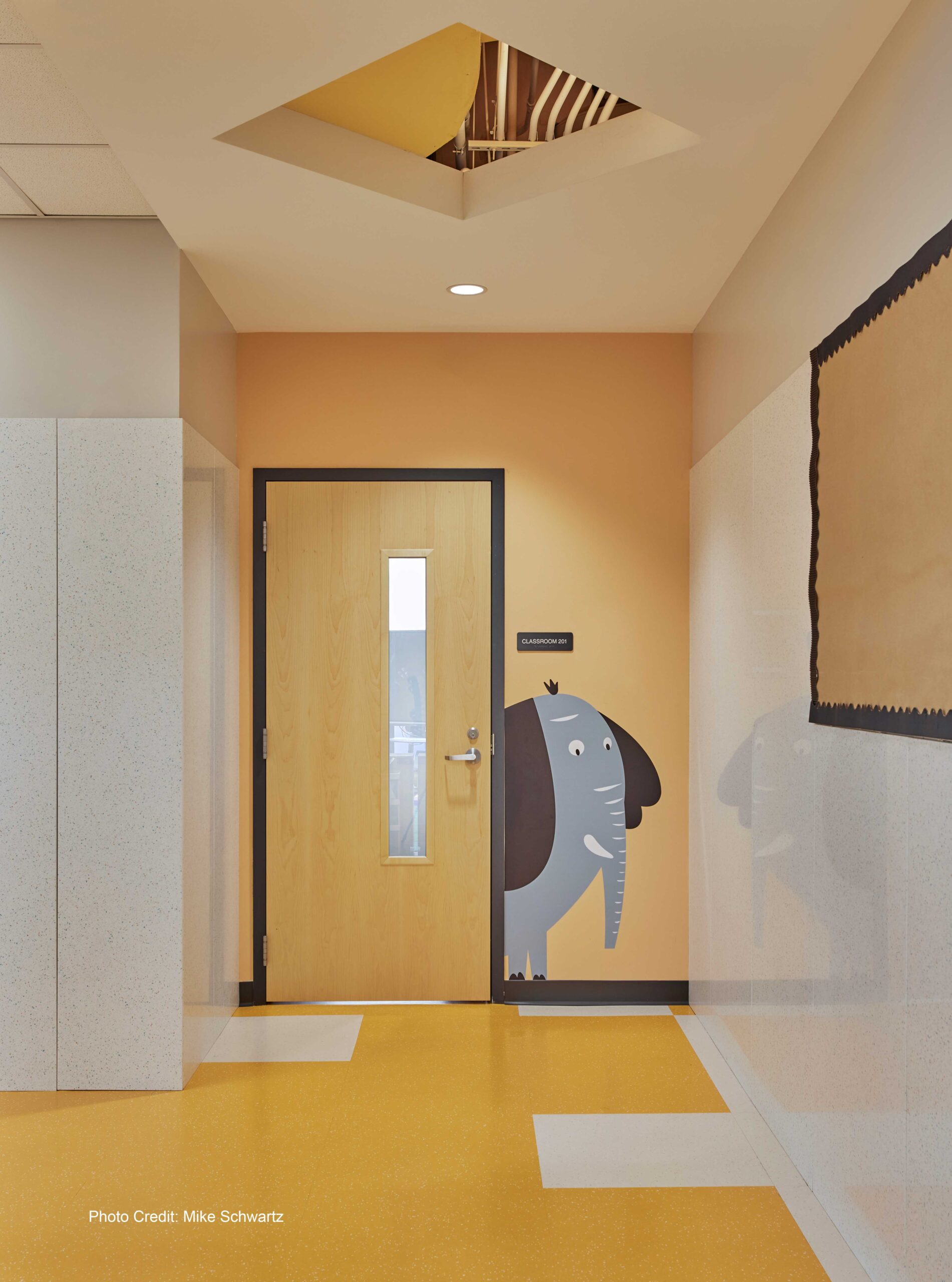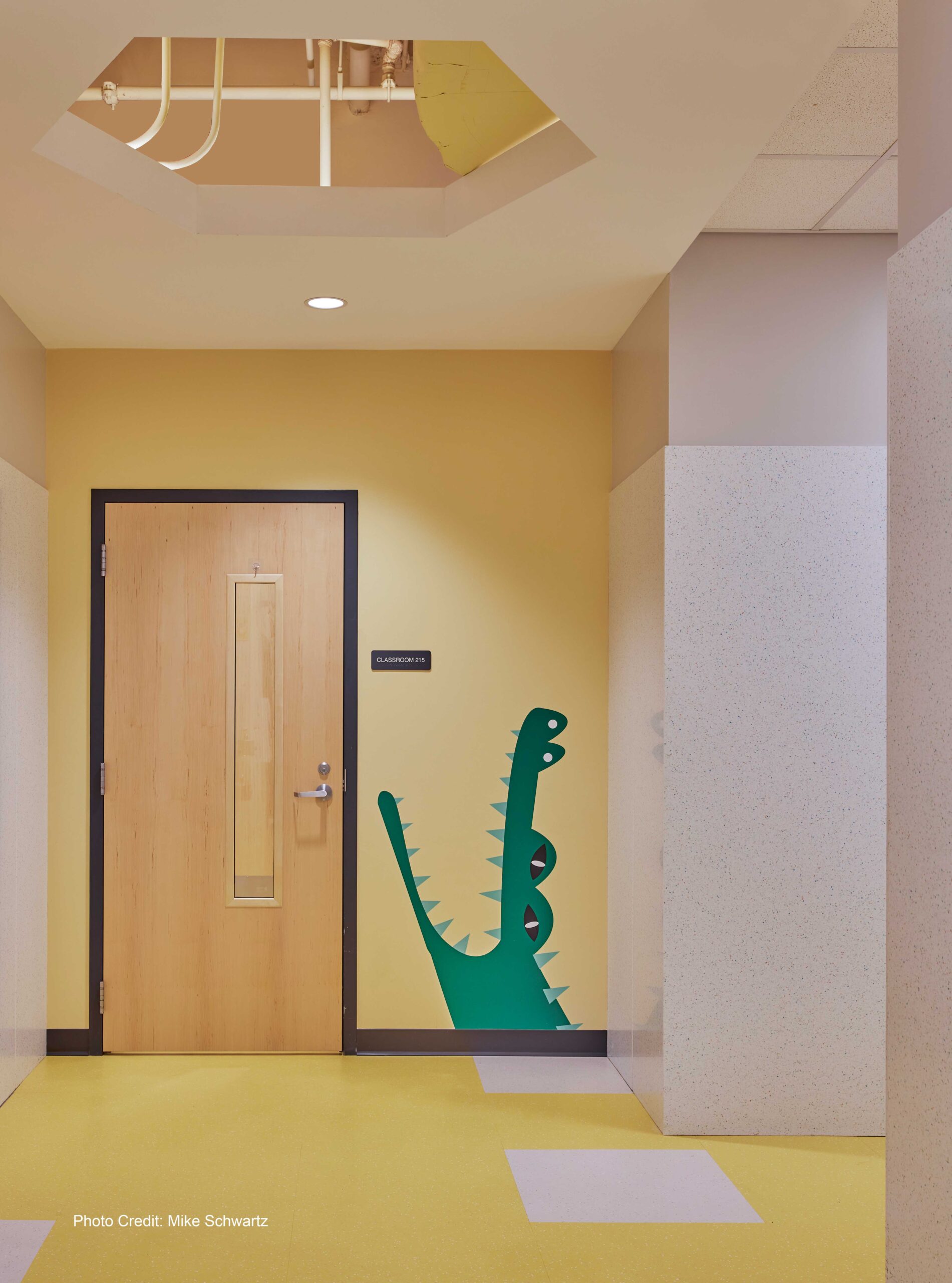 Alcott Early Learning Branch is a preschool located in Chicago’s Lincoln Park neighborhood. This 14,500 SF interior renovation has six classrooms centered around a glass multi-purpose room. Each corner of the floor plan is a accented by a different color, shape, and animal. These playful elements help children with wayfinding, allowing them to easily identify their classroom.