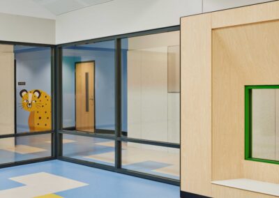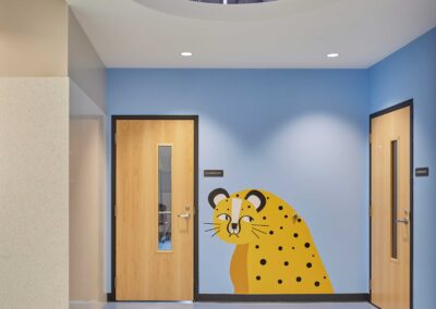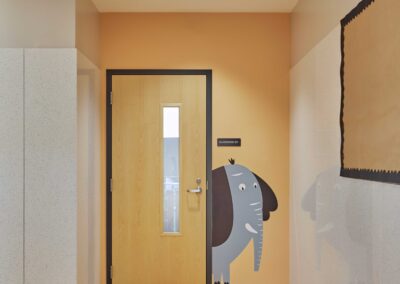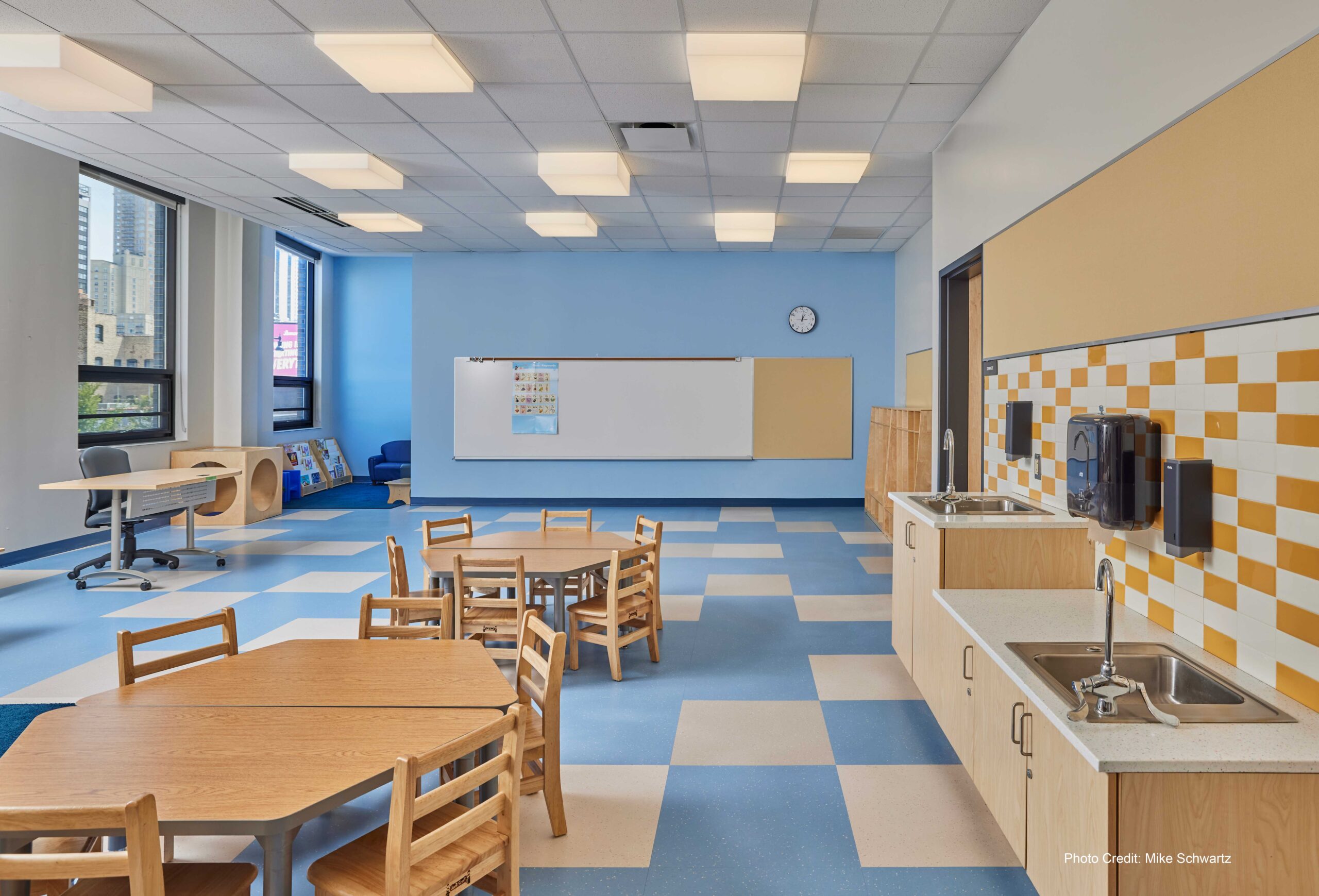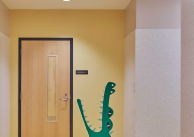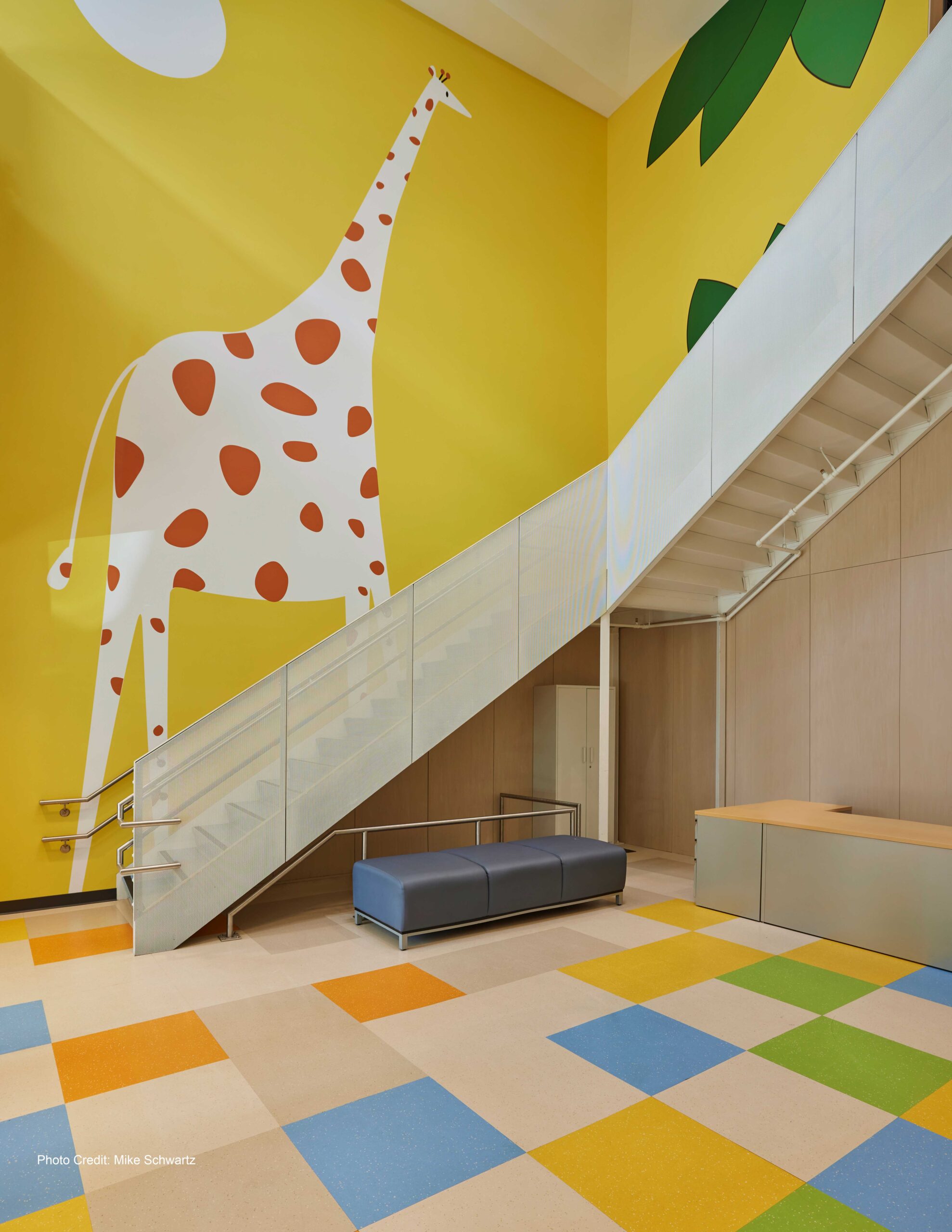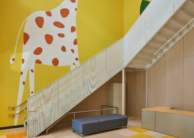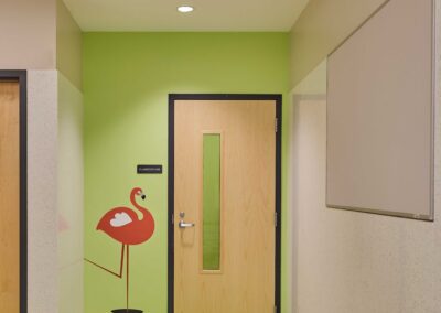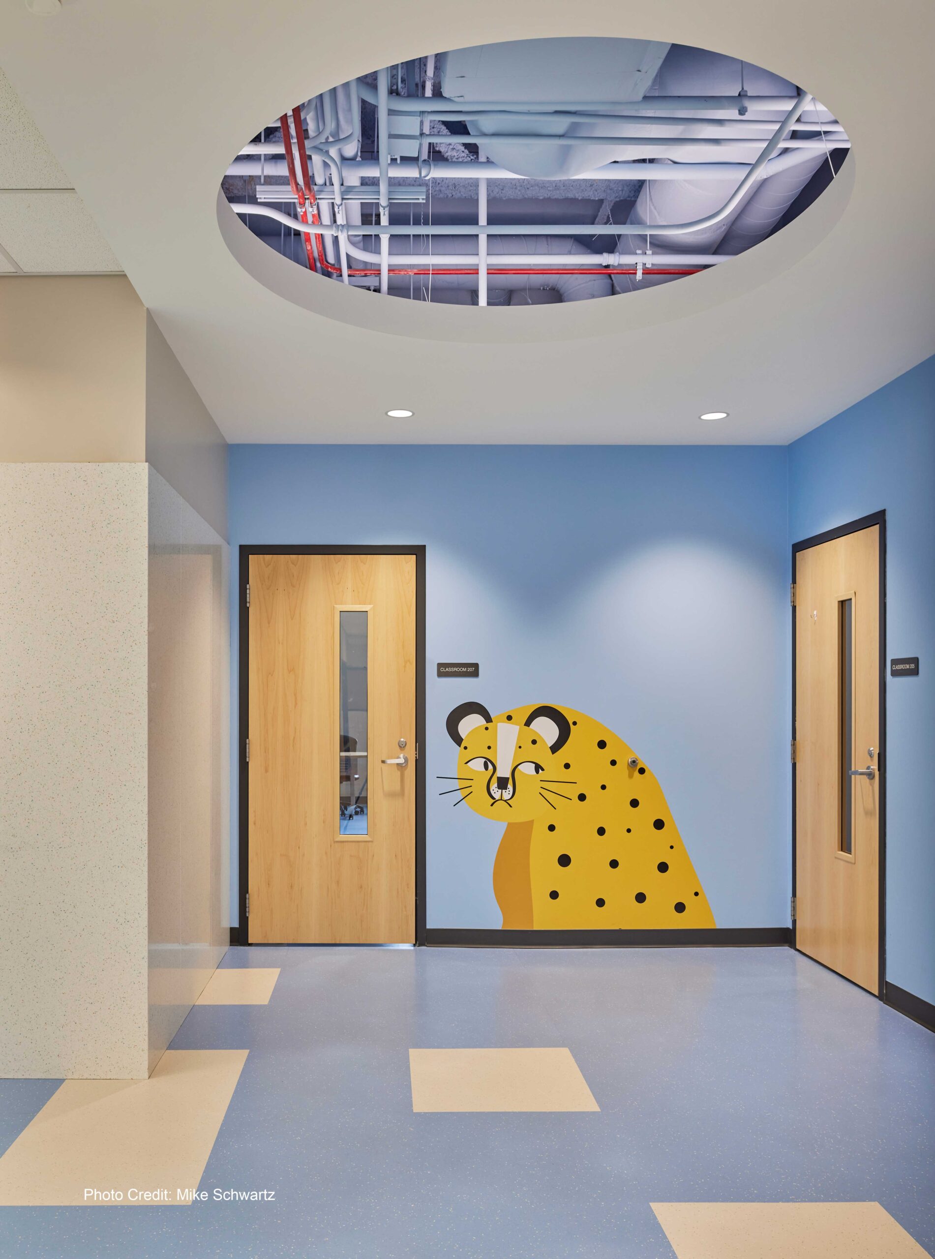 Alcott Early Learning Branch is a preschool located in Chicago’s Lincoln Park neighborhood. This 14,500 SF interior renovation has six classrooms centered around a glass multi-purpose room. Each corner of the floor plan is a accented by a different color, shape, and animal. These playful elements help children with wayfinding, allowing them to easily identify their classroom.
