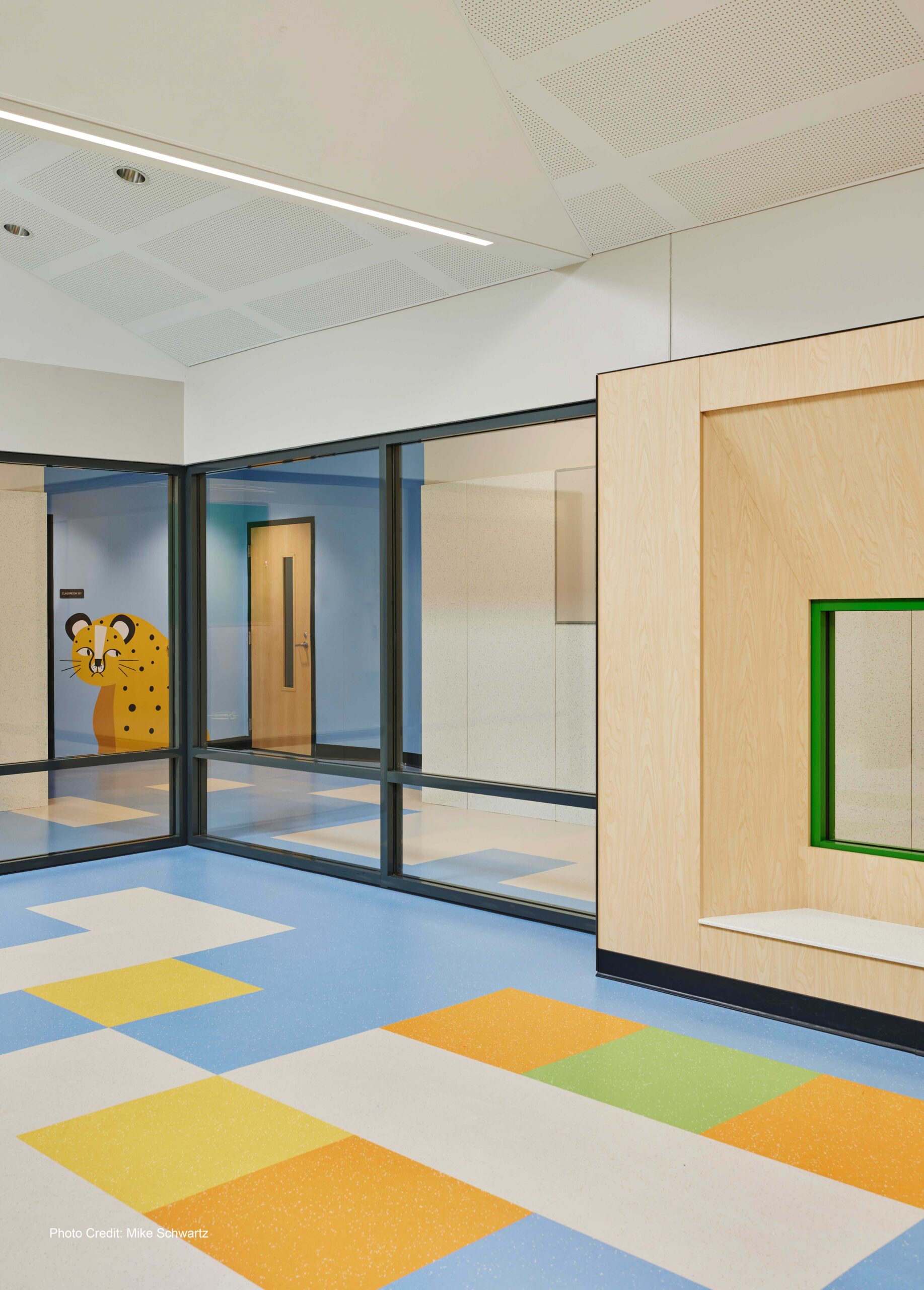 The accent colors are highlighted on the floors, walls, and ceiling cutouts that are above the classroom entryways. In the corridor, the floor pattern in each corner of the square shaped plan is heavily saturated with their respective color. These colors start to blend with one another as they approach the glass multi-purpose room in the center of the space, which reinforces the idea that the multi-purpose room is a shared space.